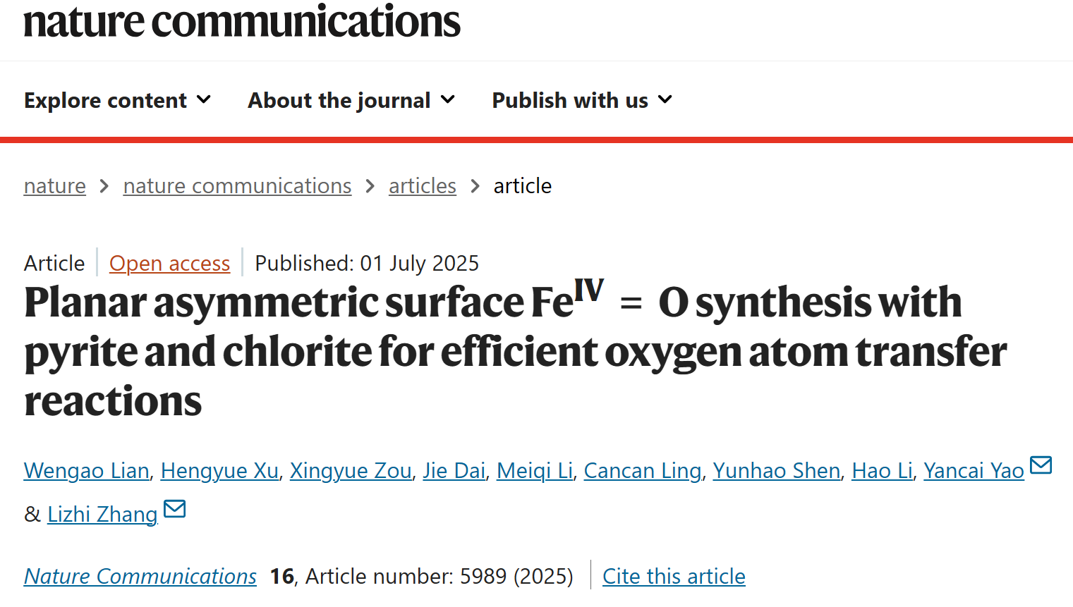 环院智慧|张礼知团队发文报道平面非对称高价铁合成及其高效氧转移反应
